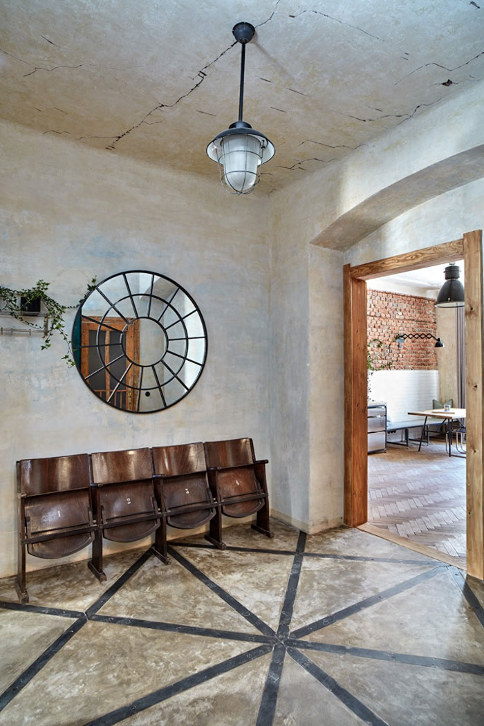 本案位于捷克的布拉格小镇,是一套翻新改造案例。斑驳的混凝土地面;深棕木色的影院椅;带裂纹的抹灰天花;复古造型的金属吊灯,从过道空间我们可以看到,许多地方都保留了旧公寓的味道。