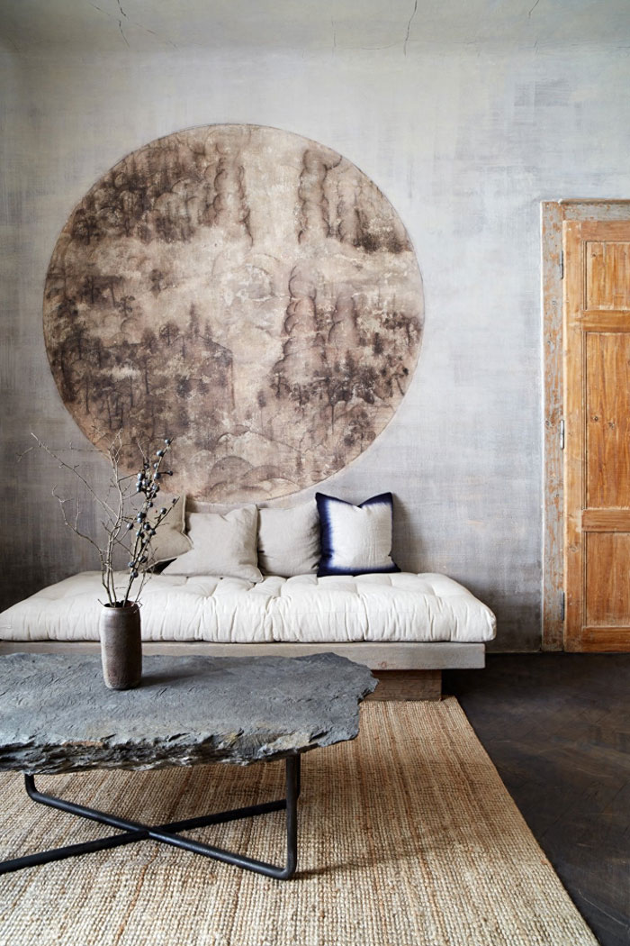 墙面简单粉刷了一遍,做出了斑驳的质感,圆形壁画还有点中国山水画的味道;已经发黑的实木地板做了简单的刷漆翻新处理,最大程度保留了旧公寓的味道;简约的布艺沙发搭配前卫的岩板茶几,家具的造型则更偏现代艺术。